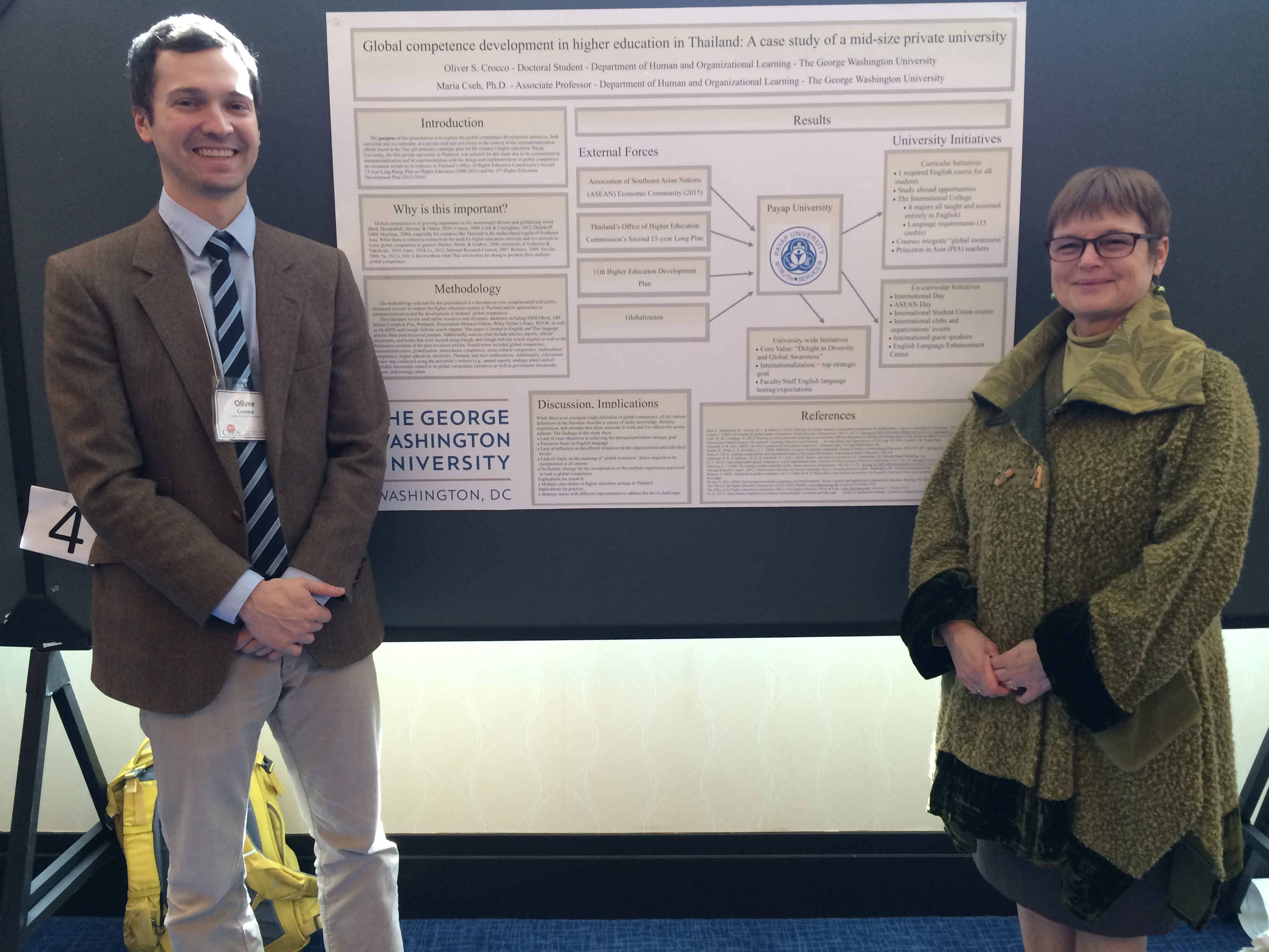 I presented with my adviser, Dr. Maria Cseh, a poster on Global Competence Development in Higher Education in Thailand: A case study of a mid-size private university. We looked at external forces such as government policy, the Association of Southeast Asian Nations (ASEAN), and globalization and how those forces affected what the university is doing to promote global competence in their faculty and students.